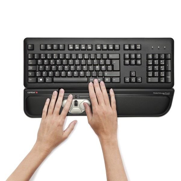 Die neuste Version der Rollermouse, die Contour RollerMouse Pro3, befindet sich mittig vor dem Körper, wodurch Sie entspannt in einer neutralen Position arbeiten können. Sie bedienen diese ergonomische Maus mit zwei Händen und reduzieren damit die Muskelspannung in Schultern und Nacken, da sich die Arme nicht außerhalb der Breite Ihres Körpers befinden. Auf diese Weise nimmt das Risiko einer Überbelastung von Nacken, Schultern und Armen ab.