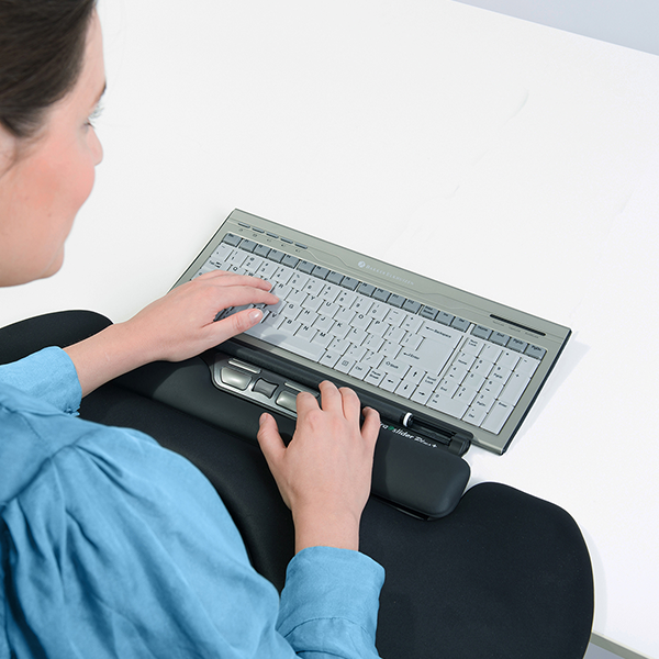 Der ErgoSlider Plus sorgt für eine optimale Mausposition zentral vor dem Körper, in einer Linie mit dem Bildschirm und/oder dem Dokumentenhalter. Mit der ErgoSlider Plus kann leicht zwischen der linken und der rechten Hand gewechselt werden.