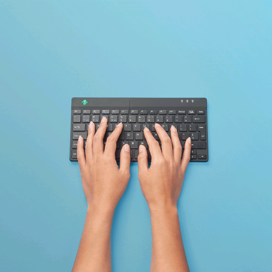 Die Tastatur besteht aus zwei separaten Teilen, die du in jeder gewünschten Position platzieren kannst. Diese Teilung verhindert eine Abknickung der Handgelenke beim Tippen. Tippen mit geraden Handgelenken reduziert die Muskelspannung und verhindert das Einklemmen von Sehnen und Blutgefäßen. Durch den eingebauten Magneten kannst du die beiden separaten Teile der Tastatur mit einer Bewegung in eine kompakte Tastatur verwandeln. Das kompakte Format sorgt dafür, dass die Maus immer in Reichweite ist. Durch den leichten Tastenanschlag entsteht beim Tippen nur minimale Muskelspannung. Die Tastatur ist flach, sodass deine Hände und Handgelenke beim Tippen flach und entspannt bleiben.