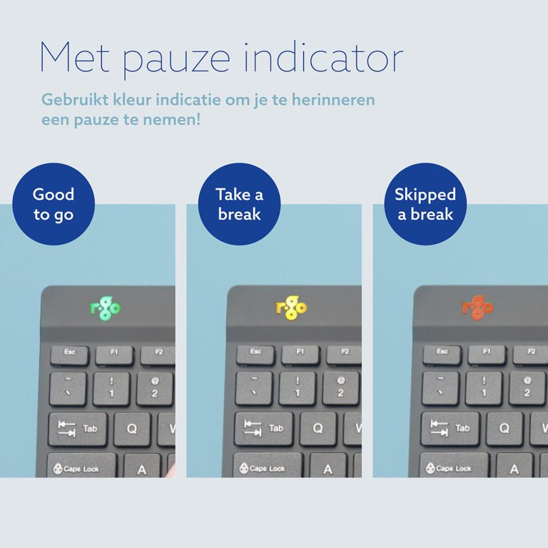 MIT PAUSENSOFTWARE: Vermeide Beschwerden, indem du regelmäßig Pausen machst. Diese Tastatur verfügt über patentierte Pausensoftware und zeigt mit Farbsignalen an, wann es Zeit ist, eine Pause einzulegen. Die Break-Software gewann 2021 den Benelux Office Award.